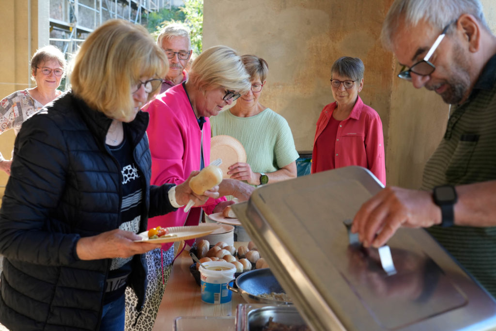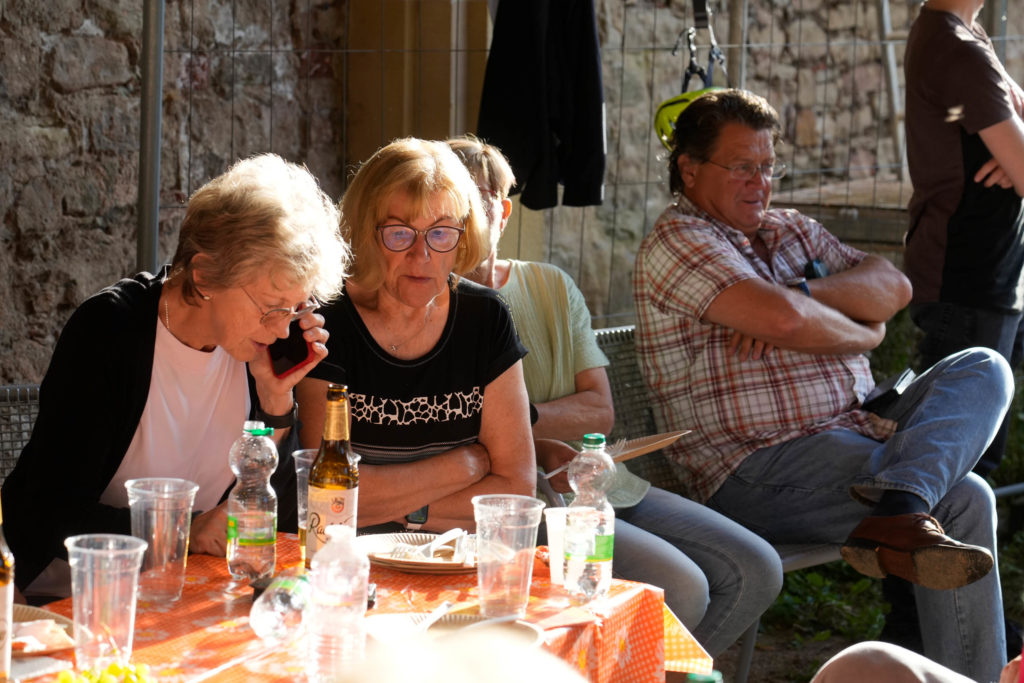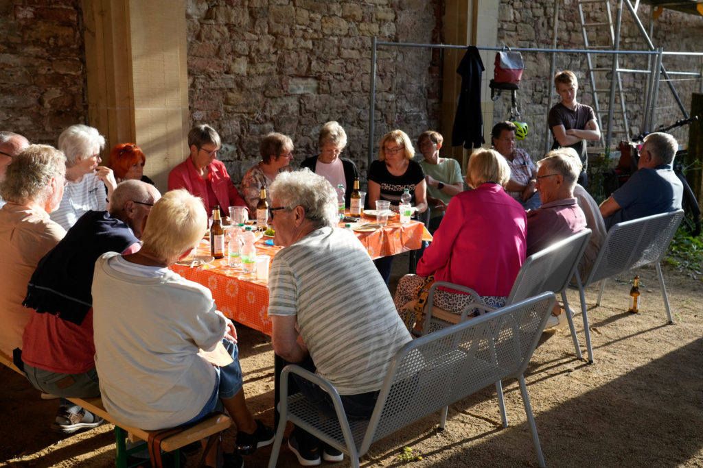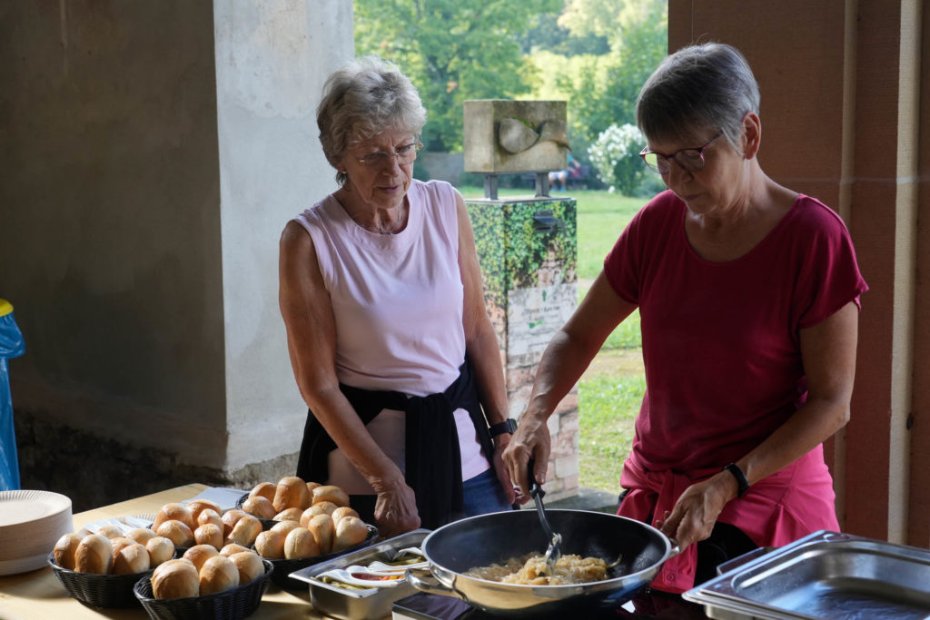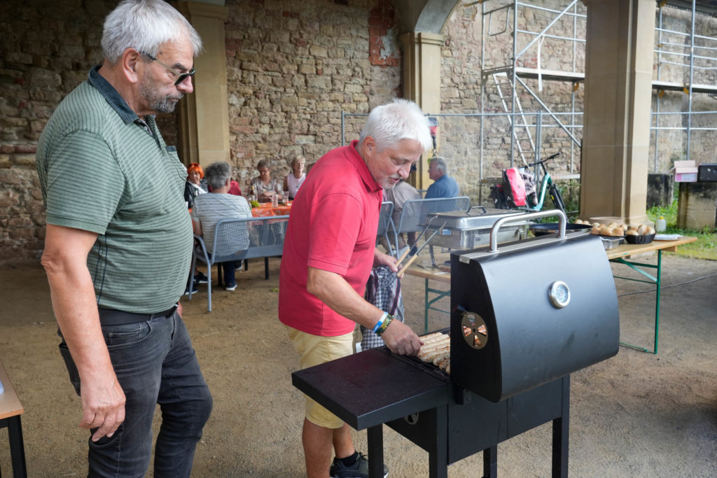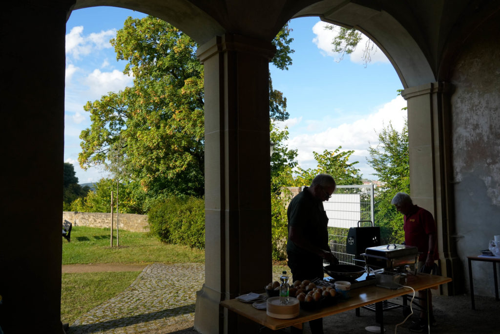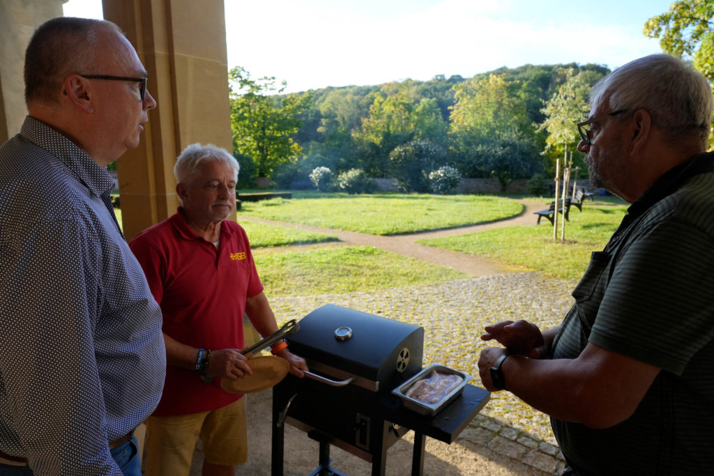 In der einladenden Atmosphäre des Schlossgartens hieß es diesmal Entspannen statt Arbeiten. Alle Vereinsmitglieder waren herzlich zu Leckeren vom Grill eingeladen. Bei herrlichem Sonnenschein und Weintrauben aus dem „eigenen“ Schlossgarten, wurde den Veranstaltungen in diesem Sommer gedacht und natürlich den fleißigen Helfern gedankt, die ganz selbstverständlich den Garten für die Schlossgartenkonzerte ansehnlich halten. Unter der Toreinfahrt wurden von unseren fleißigen ASB-Fahrern Rostbrätel mit viel Zwiebel und leckere Thüringer Roster bereitet. Dieser Ort, auch geschützt vor Regen, könnte sich auch für andere Dankeschön Veranstaltungen eignen, wurde allgemein festgestellt. (Fotos: Wolfgang Hesse)